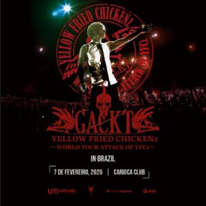 O ícone japonês GACKT confirmou sua tão aguardada passagem pelo Brasil com um show exclusivo em São Paulo, que integra a turnê mundial “WORLD TOUR – ATTACK OF YFCz”. A apresentação acontece em 7 de fevereiro de 2026, no tradicional Carioca Club, marcando o retorno triunfante do projeto GACKT YELLOW FRIED CHICKENz.